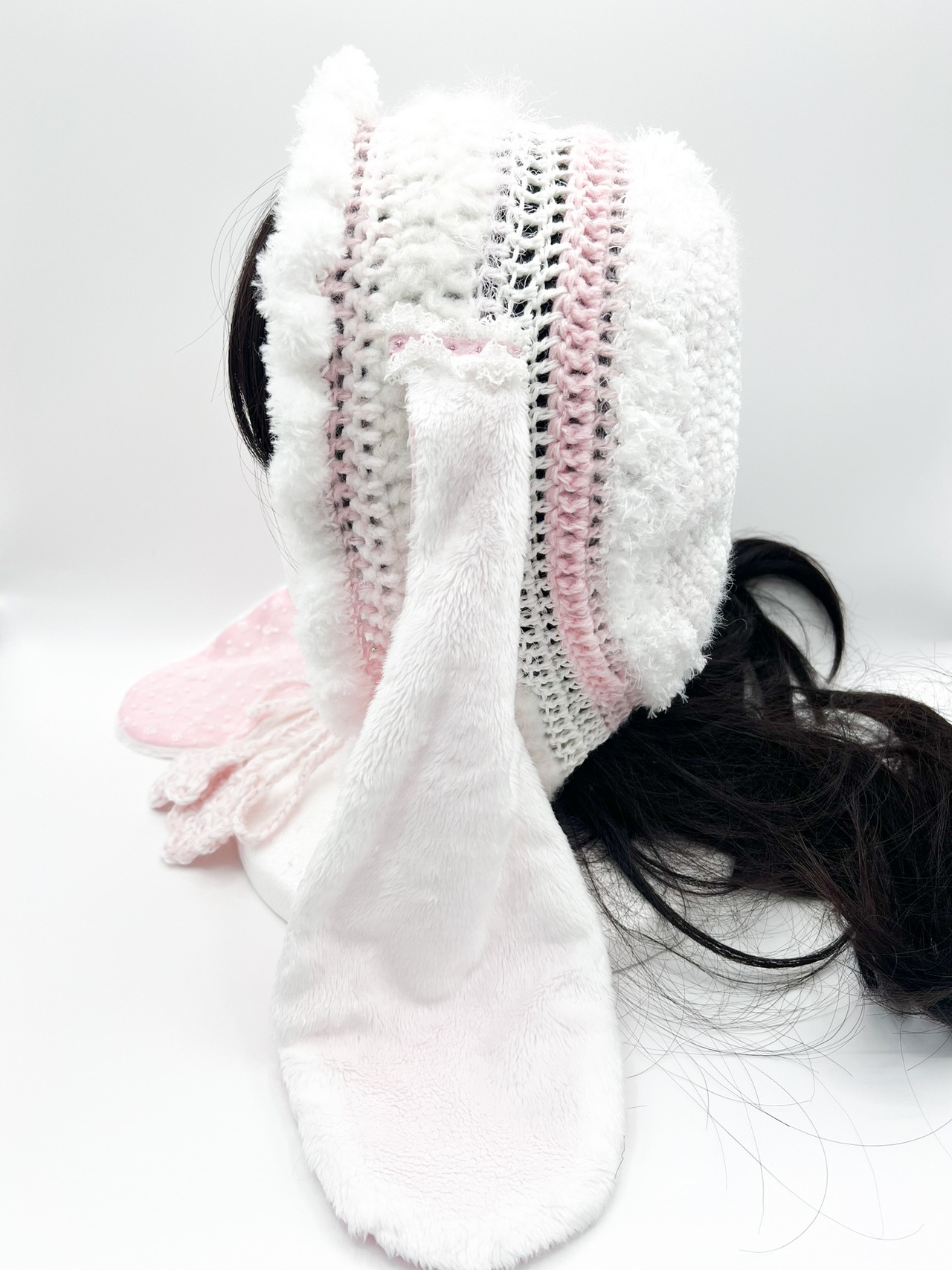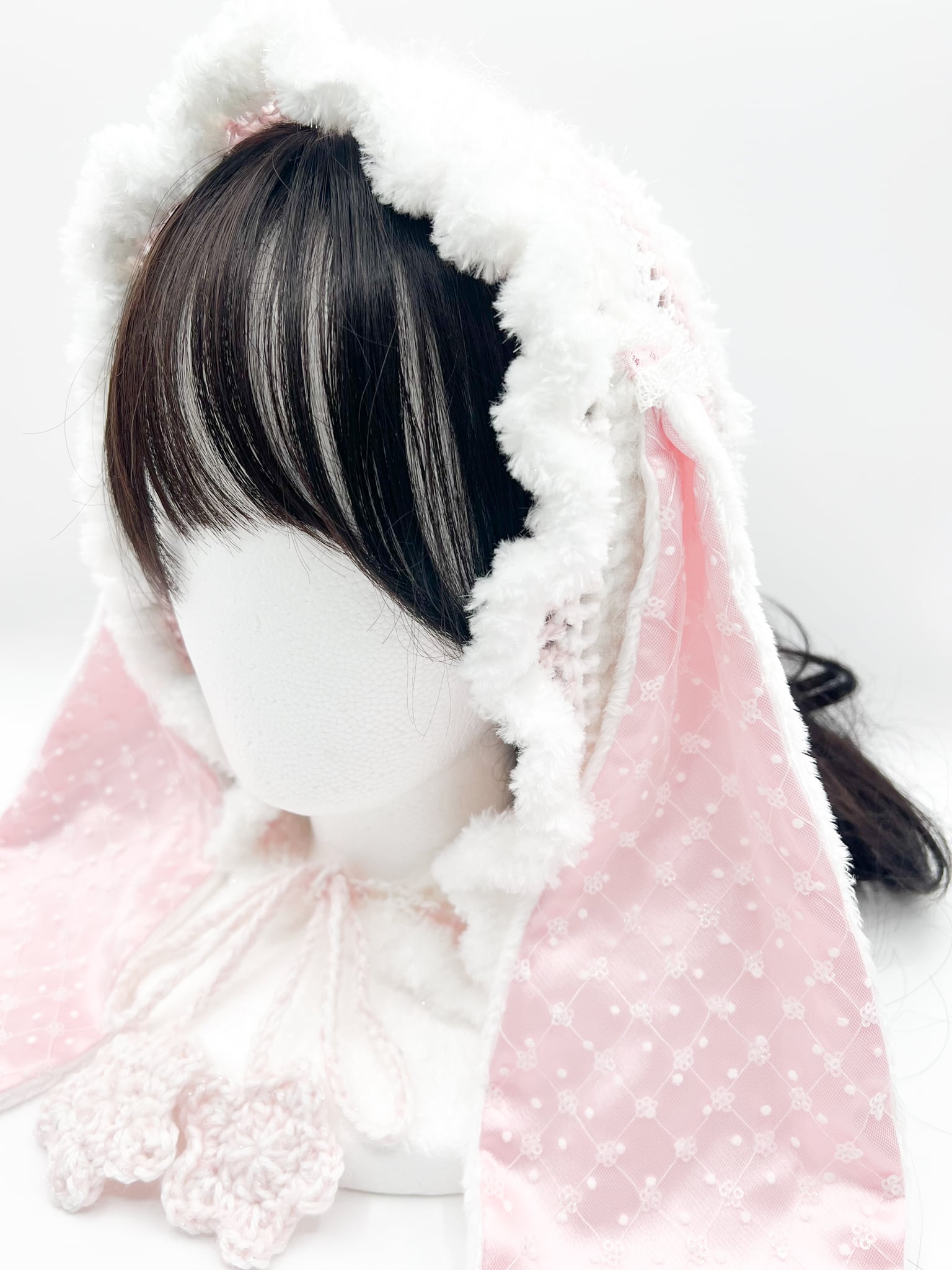 耳部分にはチュール小花ドット生地ともふもふ生地を使用し、ゆるく垂れたフォルムが愛らしい印象に。