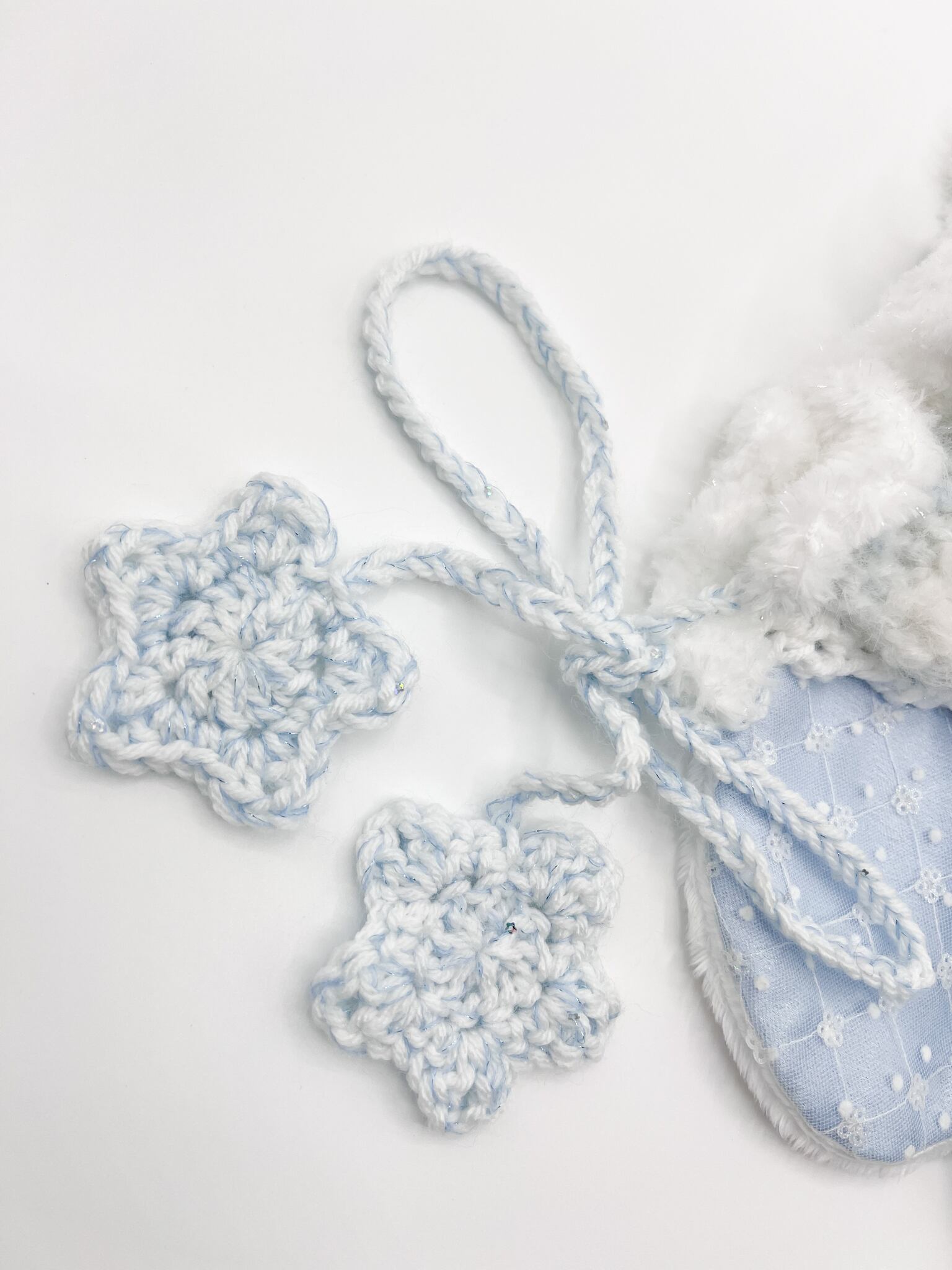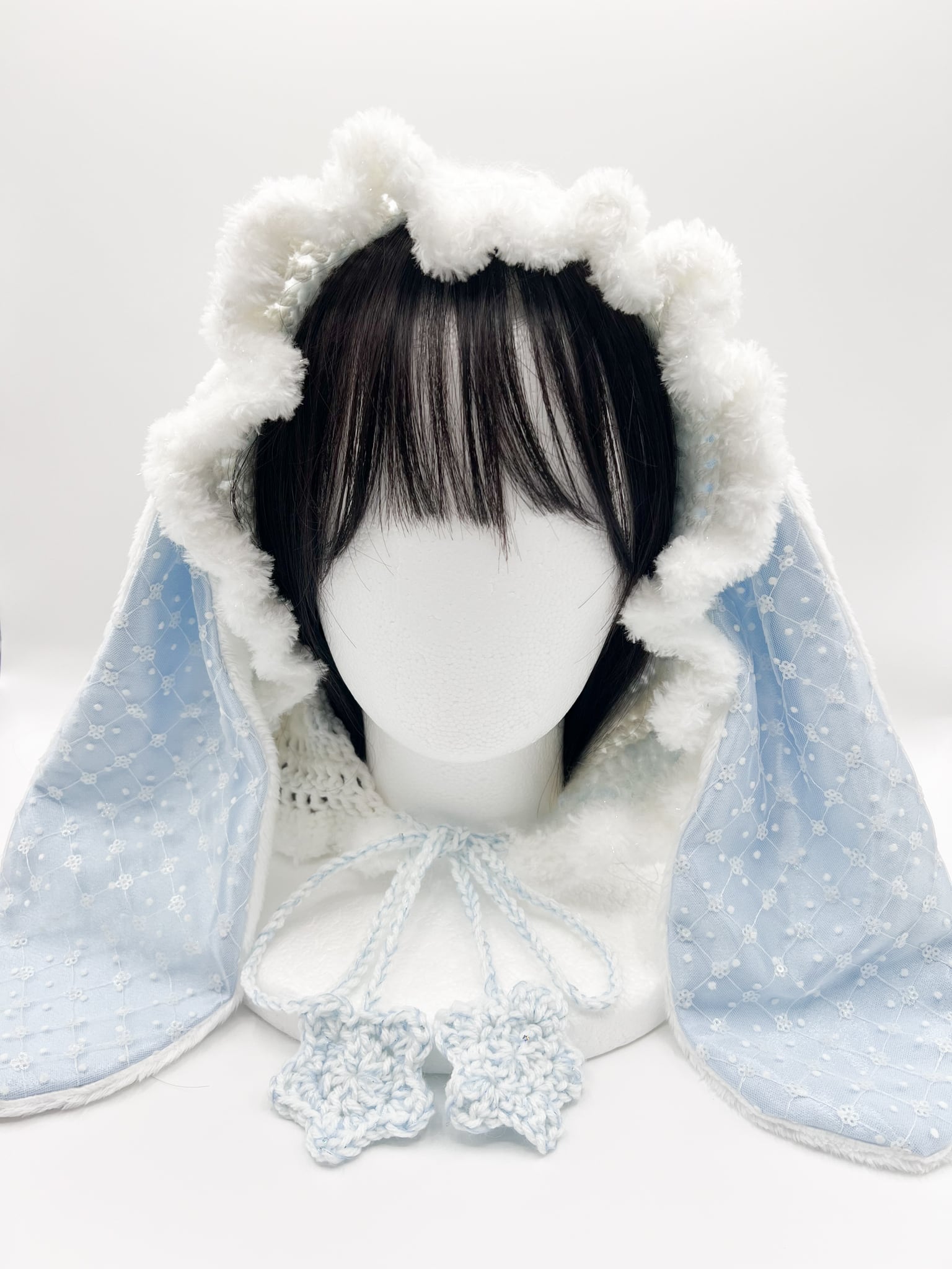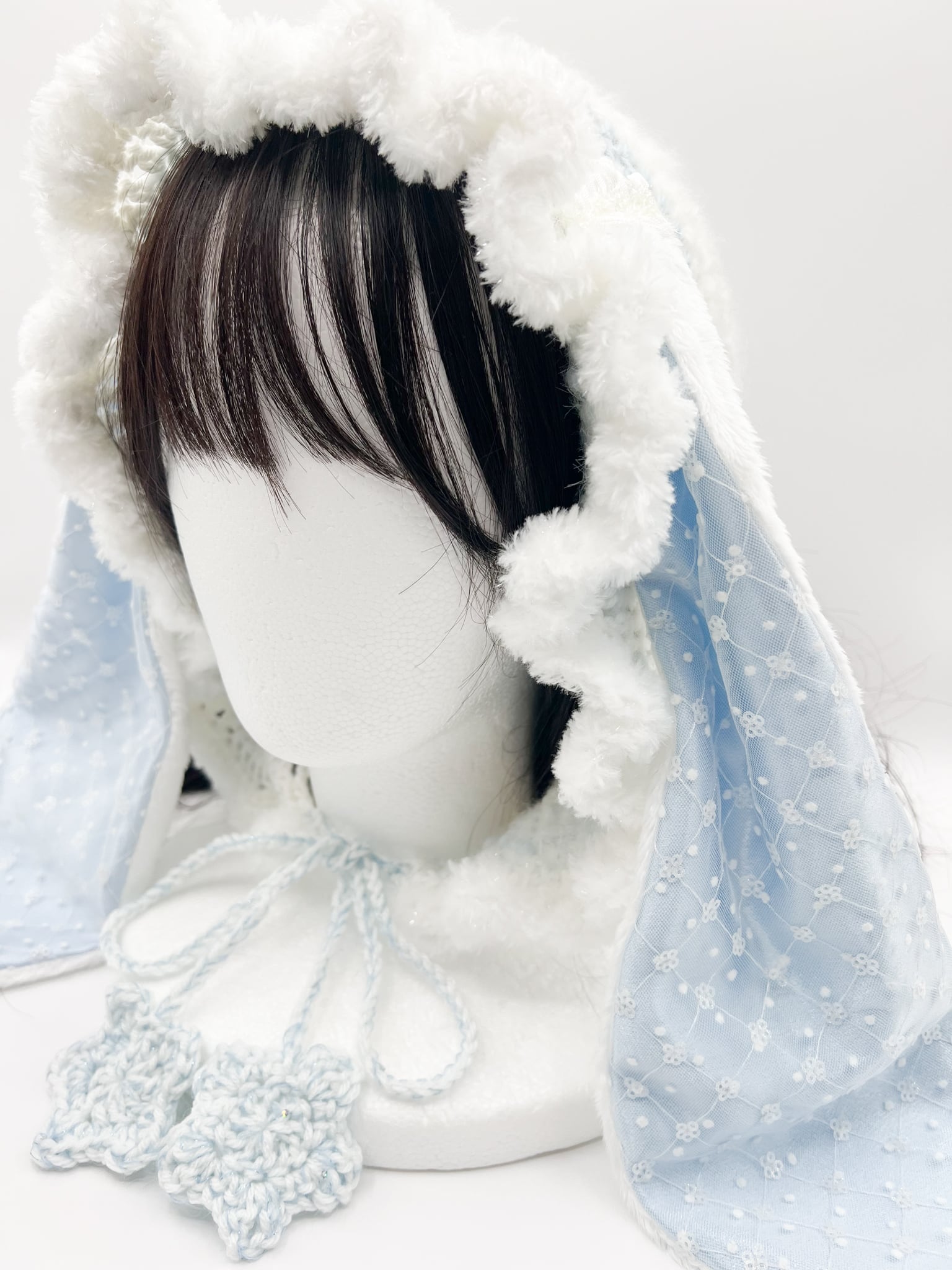 耳部分にはチュール小花ドット生地ともふもふ生地を使用し、ゆるく垂れたフォルムが愛らしい印象に。