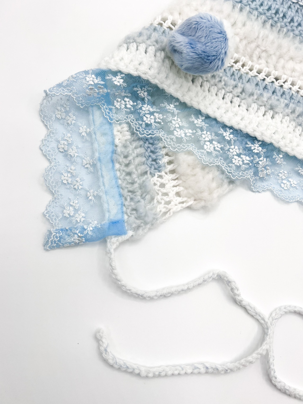 やさしいホワイトとミルキーブルーのストライプに、花柄レースを顔まわりにたっぷりあしらい、上品な印象に仕上げました。