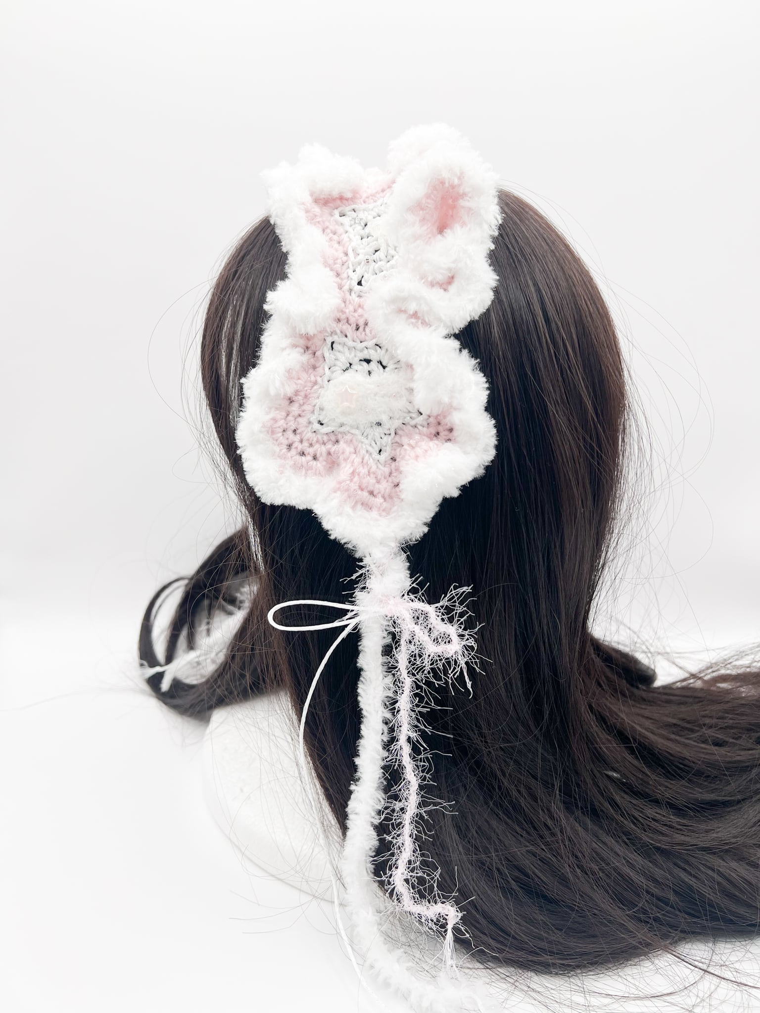 やわらかなホワイトと淡いピンクで編み上げた、ふわふわ星のモチーフの夢かわヘッドドレス。