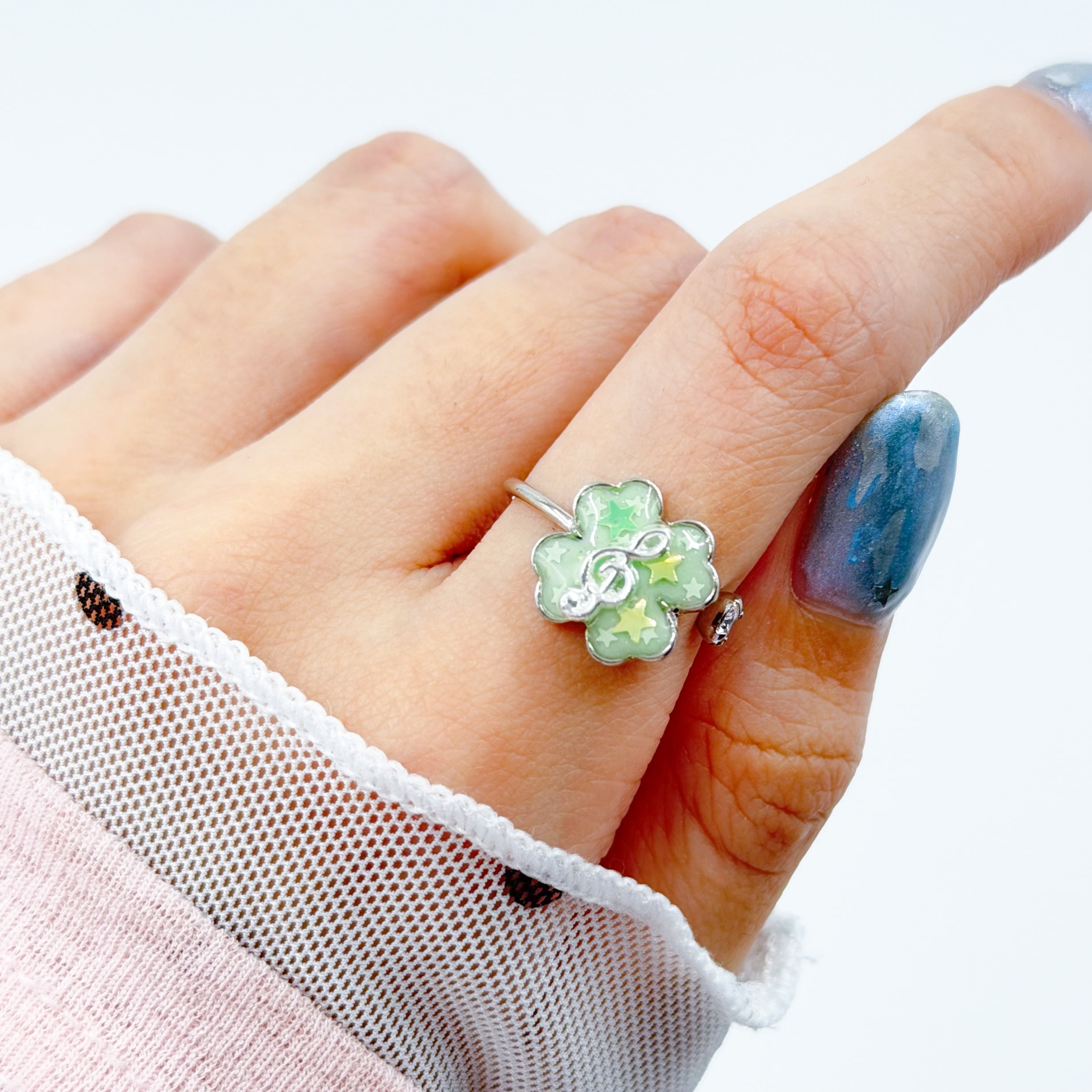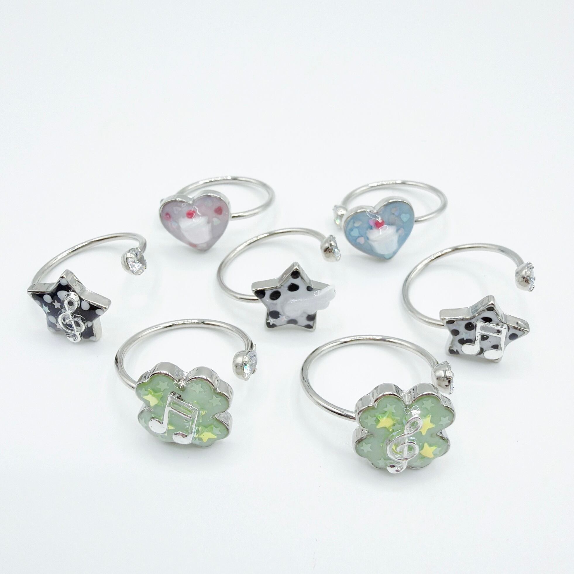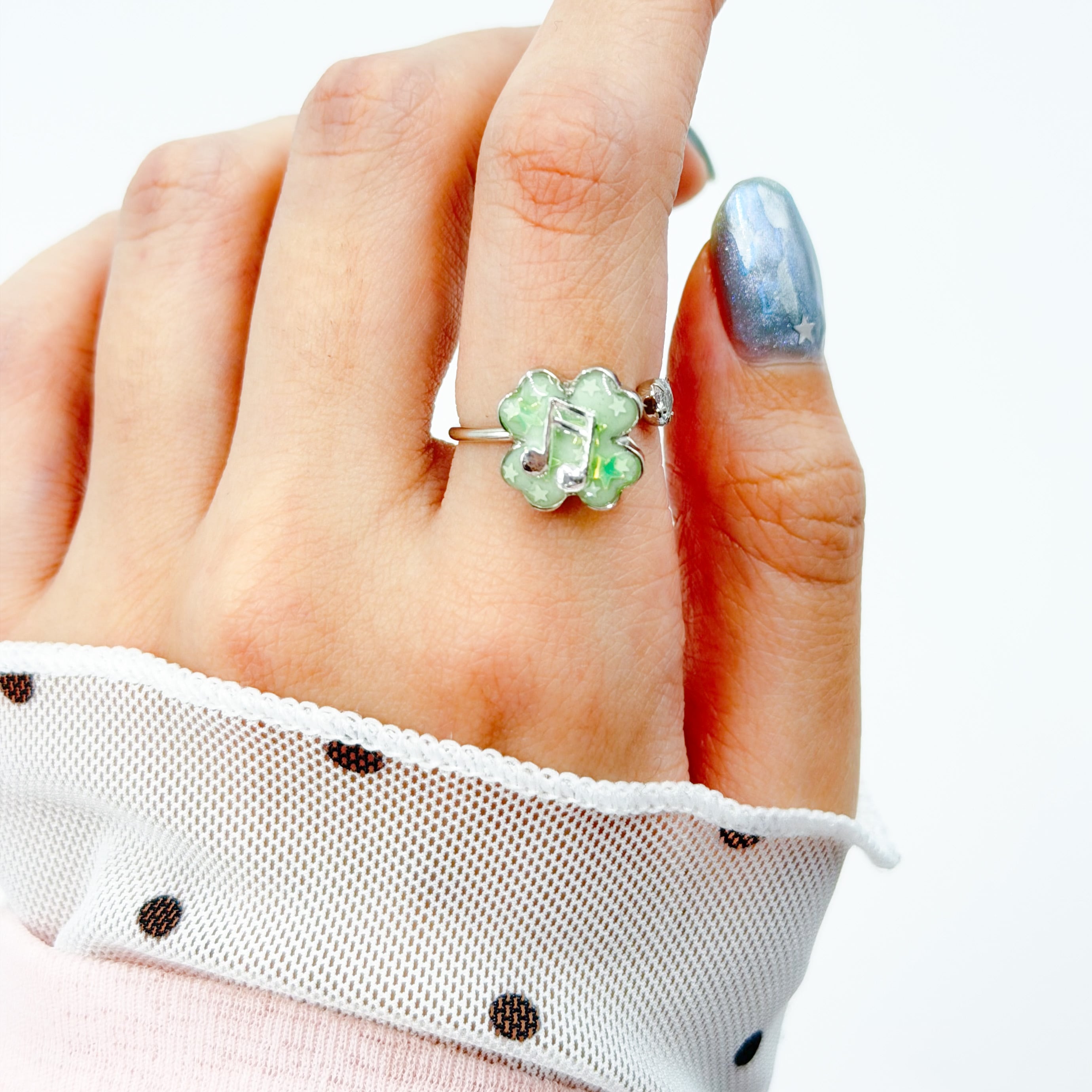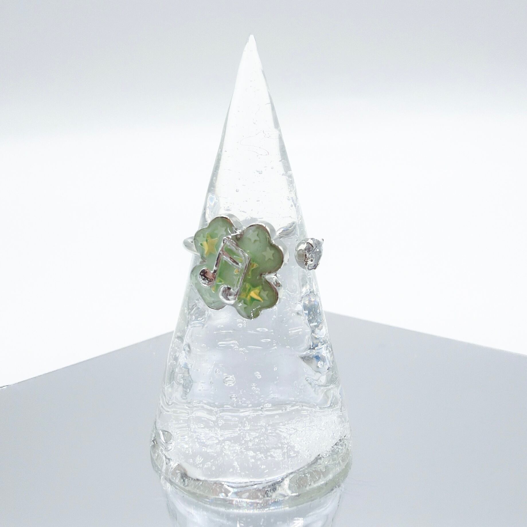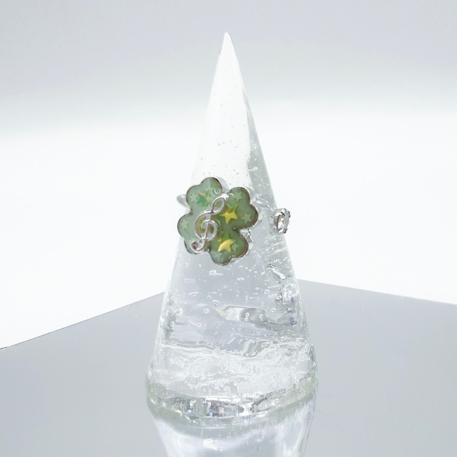 クローバーに星のきらきらホログラムとおんぷをつけたリングです!
